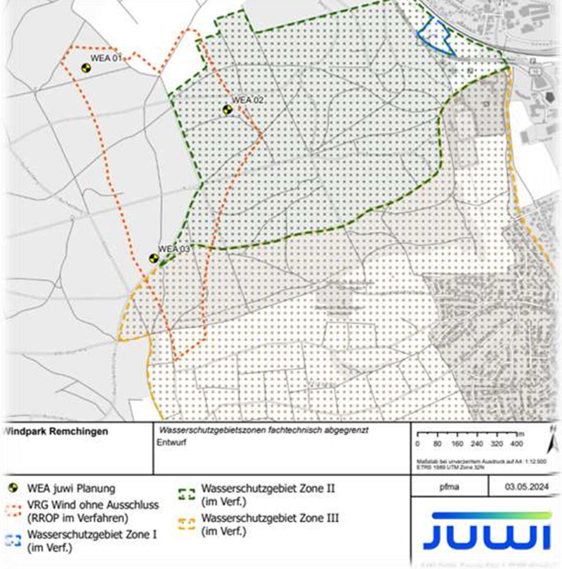 Der von der Firma Juwi vorgelegte Plan zur Bebauung des Buchwalds mit Windkraftanlagen sieht vor, dass zumindest eines der Windkrafträder in dieser Wasserschutzzone II stehen wird. Vor dem oben genannten Hintergrund kann dies unserer Ansicht nach nicht akzeptiert werden.